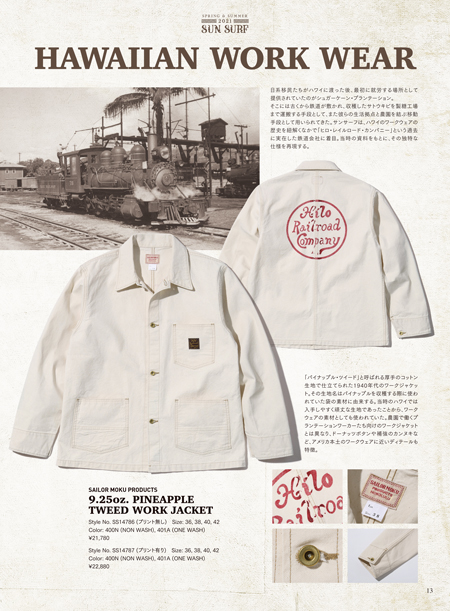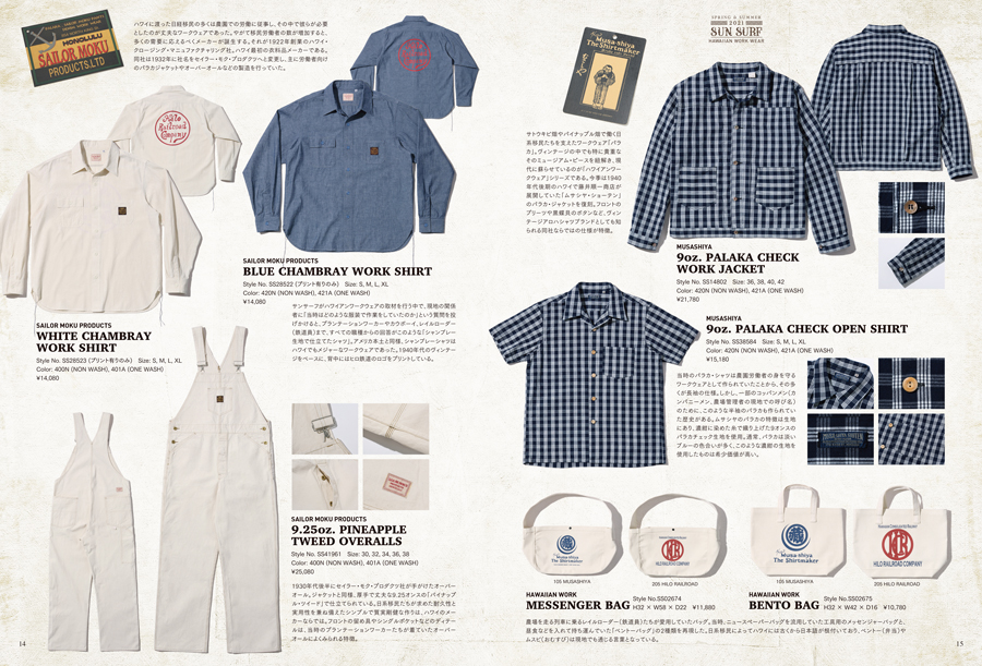 The cover art we opted for this year’s catalog is one of the famous vintage Hawaiian shirts, so-called “Macintosh Menu design”. It comes from a menu cover designed for the restaurants on luxury liner, Matson Line, that offered cruising services between San Francisco and Hawaii from the early 20 century to 1969. The art of a ukulele drawn by Frank Macintosh had been appeared on the menu during the late 1930s-40s, the vintage shirt with the art printed is still regarded as one of the most popular Hawaiian shirts. Sun Surf will release 9 styles of the master piece of Hawaiian shirts, as special edition shirts, from end of April to end of June.