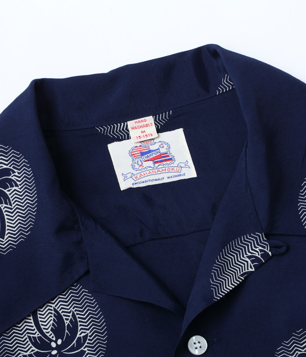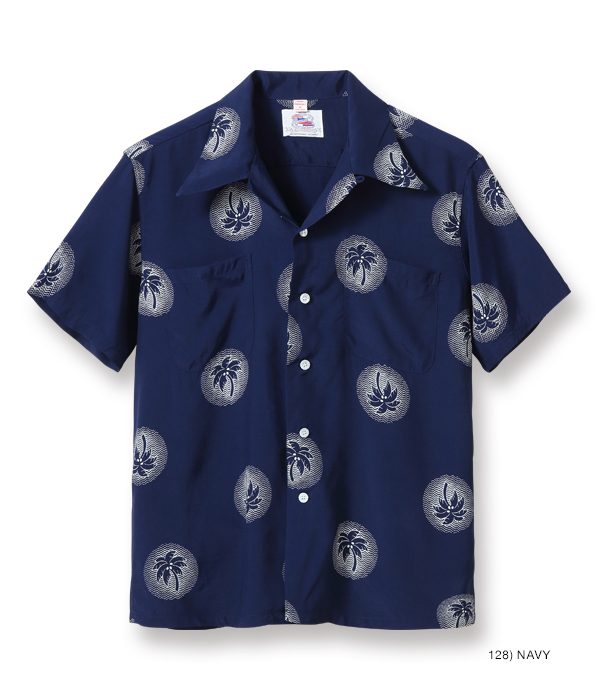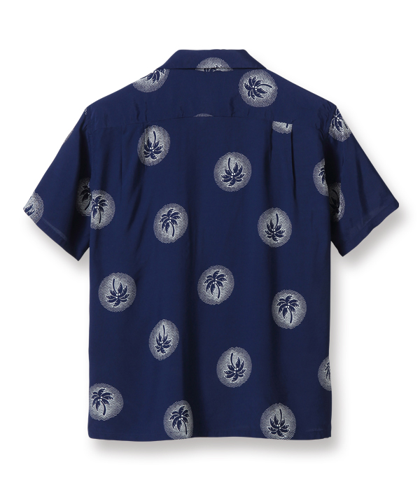 ビーチボーイたちを束ねるワイキキのファッションリーダーであったデューク・カハナモク。彼は後にオリンピック水泳の金メダリストとなり、自らの知名度を武器にハワイの発展のために尽力した。当時、観光客向けのギフトとして揺るぎない人気を誇っていたアロハシャツ。アメリカ本土でのリゾートブームも追い風となり、その需要は飛躍的に高まっていった。デュークも自身の名前を冠するブランドで多くのファンを取り込み、アロハシャツの地位をギフトという位置付けからファッションアイテムとして扱われるところまで引き上げた。繊細に描かれたモノトーンのヤシの木が大きなドットとなり、洗練された雰囲気とともに強いインパクトを放つこの作品は、過去に出版されたどの書籍にも登場することのなかった珍しいデザイン。