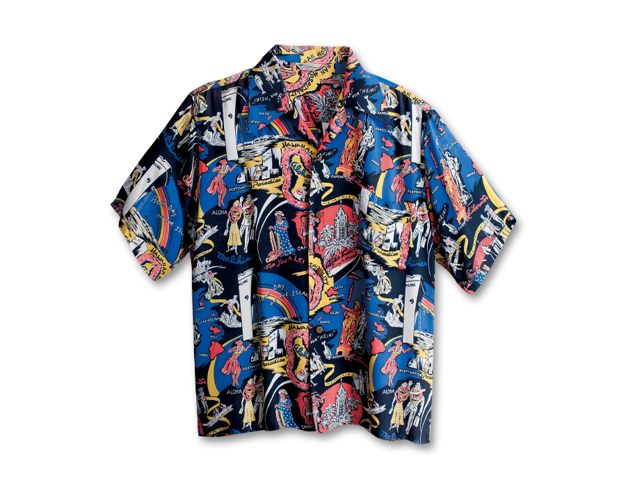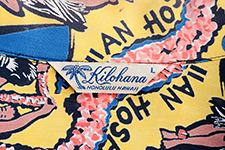 〈キロハナ〉は、1952年創業のキロハナ・ディストリビューターズ社のブランド。他社製品と差別化するために作り出した独創的な柄のアロハシャツは、現在でも高く評価されている。アロハタワー、ルアライン、ロイヤル・ハワイアン・ホテルなどの人気モチーフと共に描かれているのは、ハワイの象徴カメハメハ大王とアメリカを象徴する自由の女神。コレクターにはたまらない非常に希少価値の高い作品。