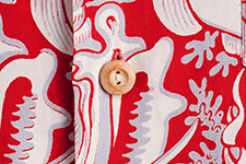 トロピカルフィッシュ(熱帯魚)やコーラル(珊瑚)、貝殻などのモチーフを、ボーダー・パターンに配した〈ロイヤル・ハワイアン〉の作品。一見、単色で白抜きの抜染プリントを施しただけのように見えるが、シャープなラインで細かいディテールまで描き込み、さらに薄いグレーを差して柄に陰影を付けるなど実は手が込んでいる。モノトーン調でシンプルだが、デザイン性の高い作品に仕上がっている。