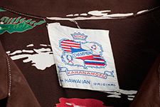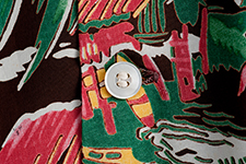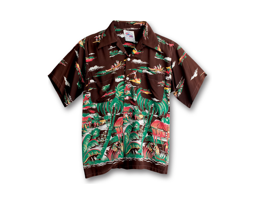〈デューク・カハナモク〉ブランドの初期の作品は、派手な色使いで柄に一癖あるものが多い。この《ハワイアン・ビレッジ》は、まさに初期デュークブランドの典型的なもの。ハワイにある海辺の村で生活する人々の様子が細部まで描きこまれており、抜染でプリントするには高いスキルが求められる逸品だ。〈カメハメハ・ガーメント〉と並んで両巨頭と呼ばれるブランドだけのことはある。