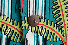ジャングルのように鬱蒼と生い茂る木々の合間に見えるのは、山肌を流れるアカカ・フォールズ(アカカ滝)。ハワイ島ヒロのはずれにあり観光名所として知られるが、色々な神話や伝承が残る神聖な場所でもある。ブランドの〈ハレ・ハワイ〉は各所からプリント生地を調達していたため、このようなホリゾンタル・パターン以外にも様々なデザインを残している。