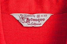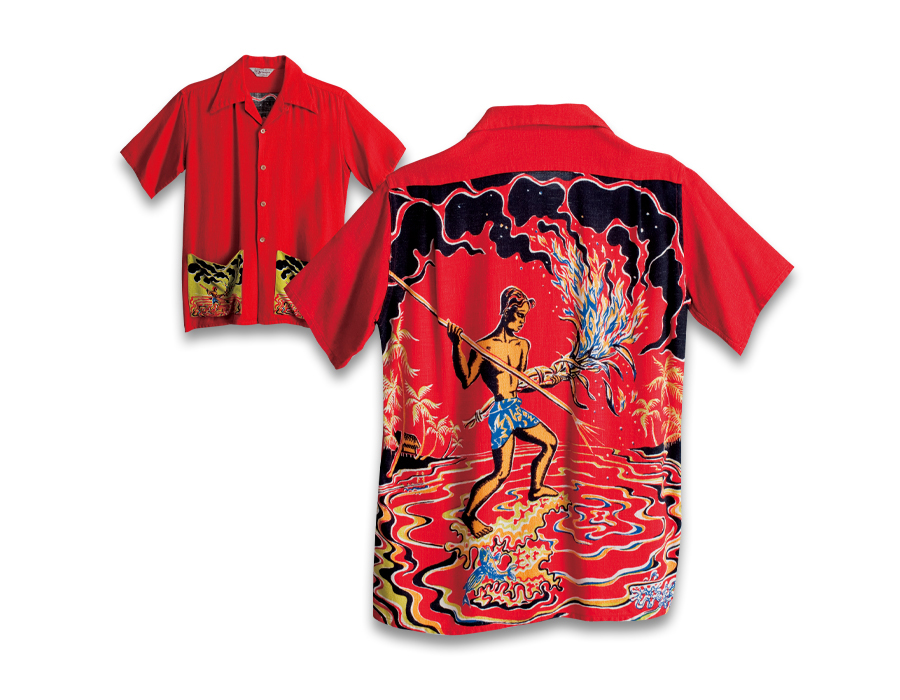 1950年代のカリフォルニア製アロハシャツを代表する〈アートヴォーグ〉の作品。背中全面を一枚のキャンバスに見立てて、フィッシャーマンが松明の明かりを頼りに漁を行う姿を描いている。静止した人物とは対照的に燃え上がる炎と煙、そして水面に広がる波紋が動きのある曲線で描かれており、獲物を狙う瞬間の緊張感がいやおうなく伝わってくる。