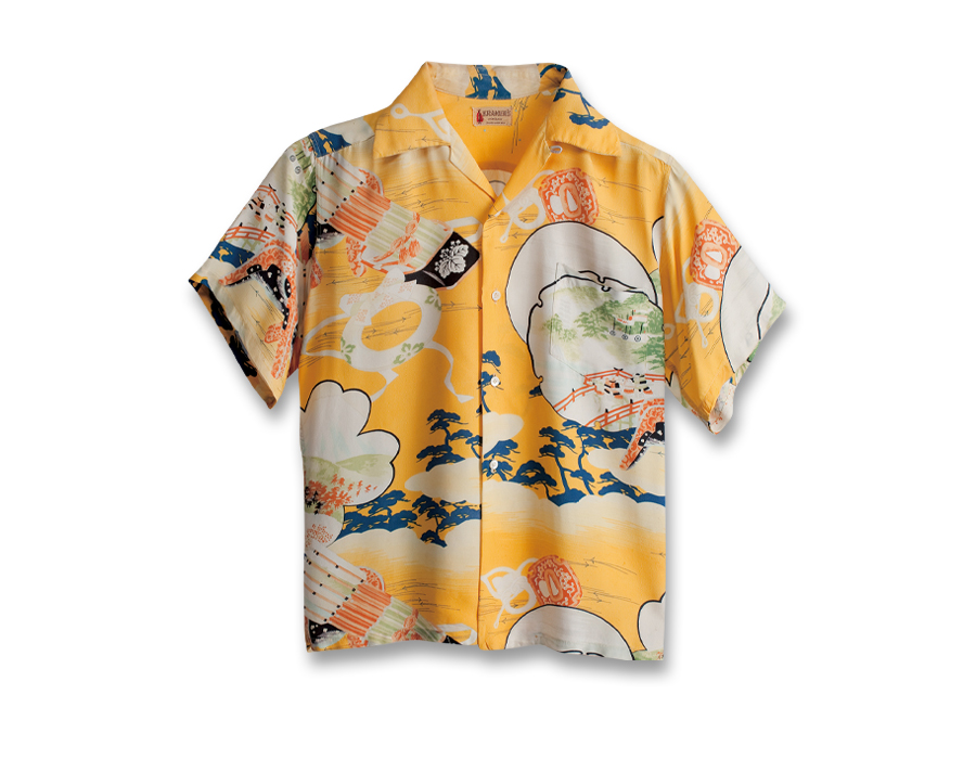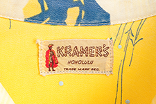 〈クレイマーズ〉は、現在もアラモアナ・ショッピングセンターに店舗を持つテーラー「サミュエル・R・クレイマー」のブランド。1942年創業で、元々アメリカ海軍のためのユニフォームなどを作っていた。この作品の中には、足利家の「桐紋・二つ引両」や甲斐武田家の「四つ割菱」といった家紋が認められる。南北朝時代を描いた『太平記』がテーマと考えられる歴史絵巻のようなデザインだ。