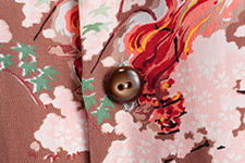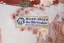 メーカーにより2種類存在するムサシヤ・ブランドのうち、宮本孝一郎がオーナーを務めた〈ムサシヤ・ザ・シャツメーカー〉の一着。オーナーの似顔絵「笑うムサシヤさん」がデザインされた特徴あるラベルがついている。10円硬貨の絵柄でも知られる国宝、平等院鳳凰堂をモチーフに、正面に広がる阿字池と龍頭船で雅楽を舞う官女などをホリゾンタル・パターンで描いた奥行きのある作品である。